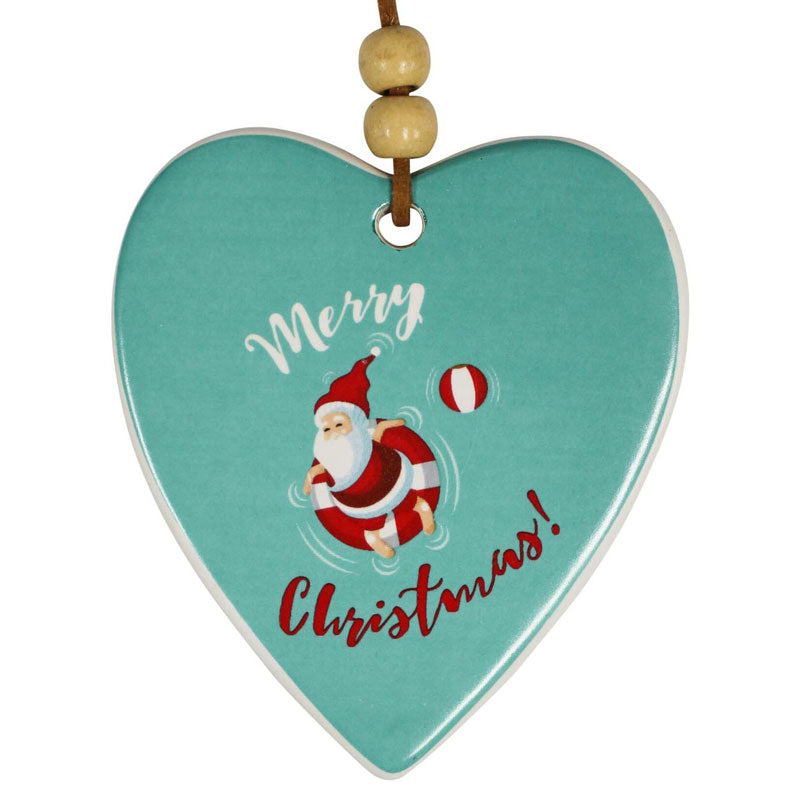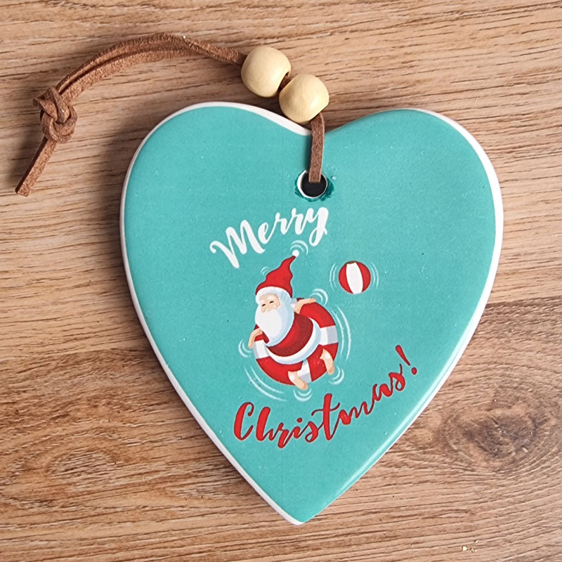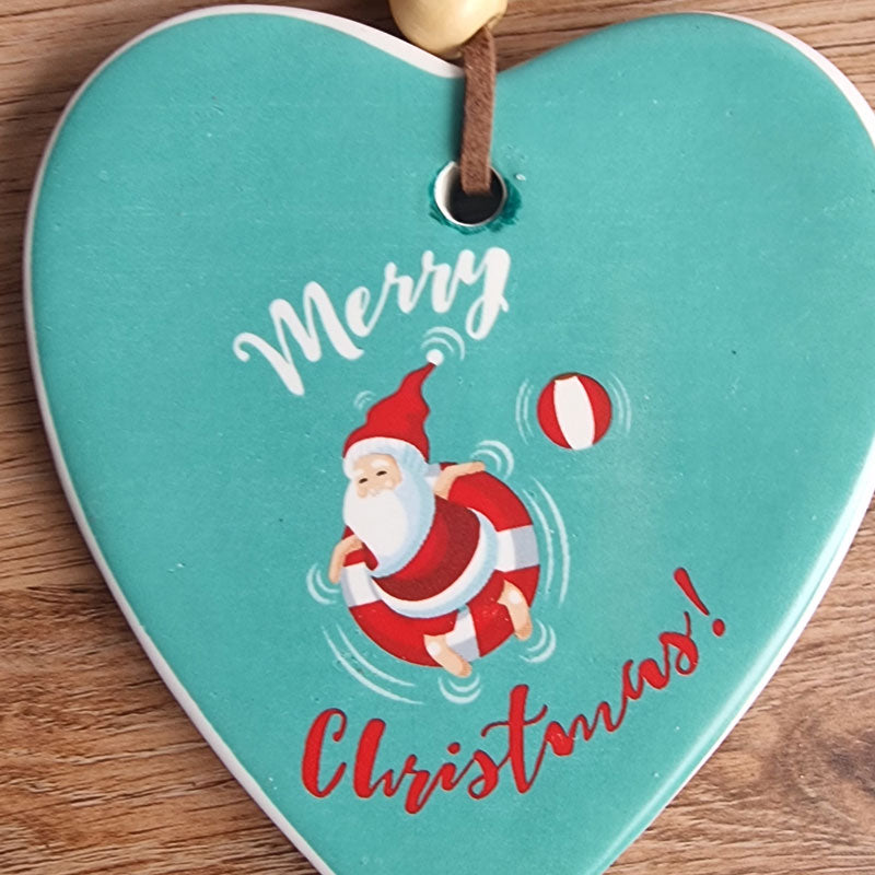 A cute hanging heart ornament that makes the perfect little Christmas gift. Features a cute Santa on the beach, with the words "Merry Christmas".