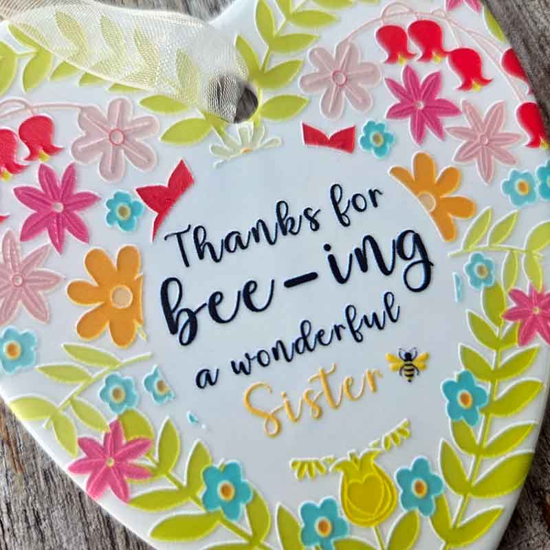 A cute hanging heart bee ornament that makes the perfect little gift idea for your sister.