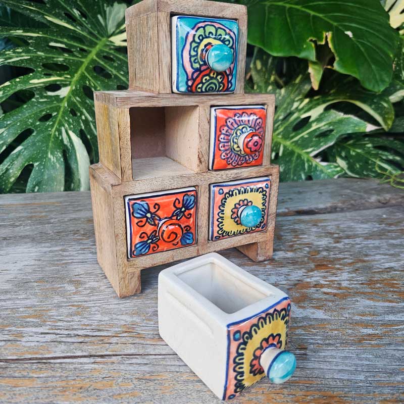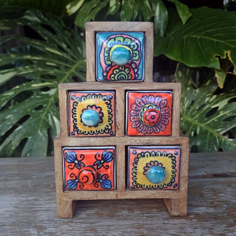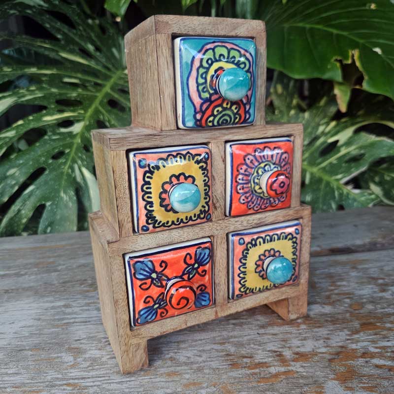 A beautiful hand painted 5 drawer step box that is the perfect place to store your trinkets and treasures! Handcrafted by Artisans in India, this stunning wooden box will make a delightful gift, including for yourself! The pullout drawers are made from ceramic (hand painted) and are a great place to store jewellery, trinkets, small stationery items like paperclips, staples or drawing pins, or place these drawers in the kitchen as a stunning spice box.