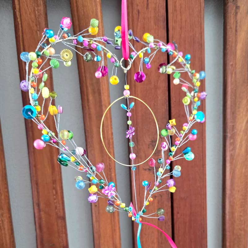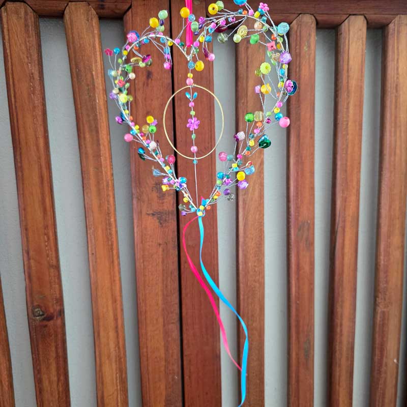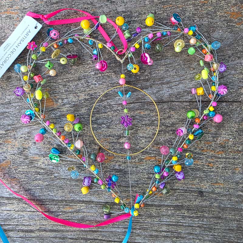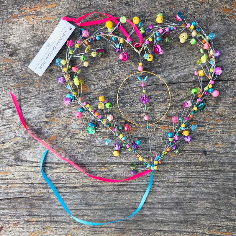 A stunning uniquely handmade hanging heart ornament in a mix of pretty colours. Crafted from small beads and bells around a wire heart shape. This heart is handmade by Artisan Decoration, a project that supports and empowers women.