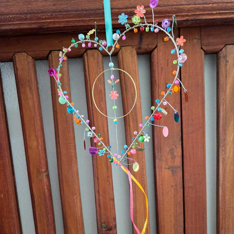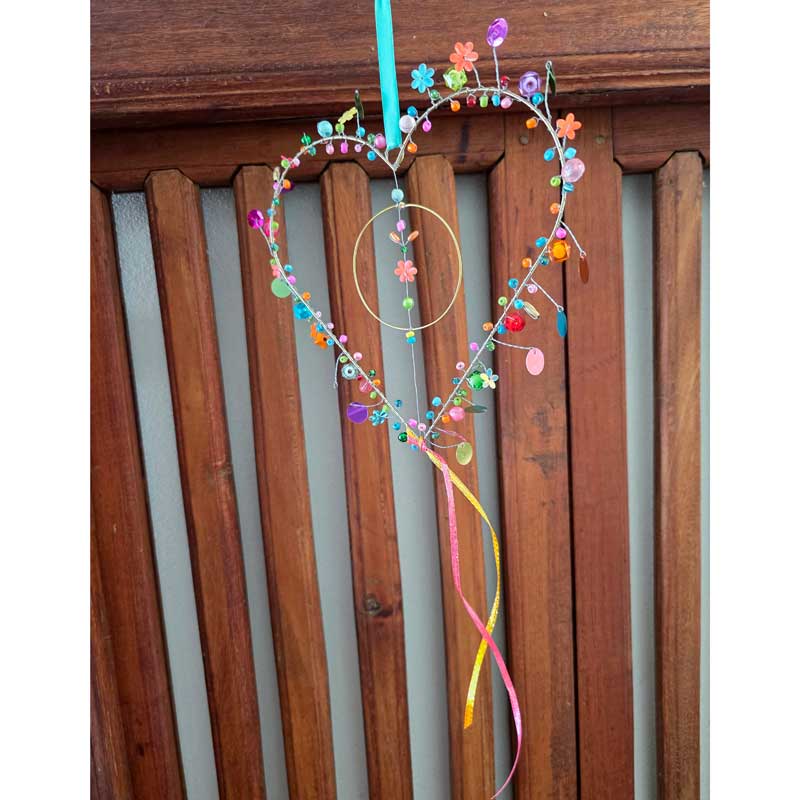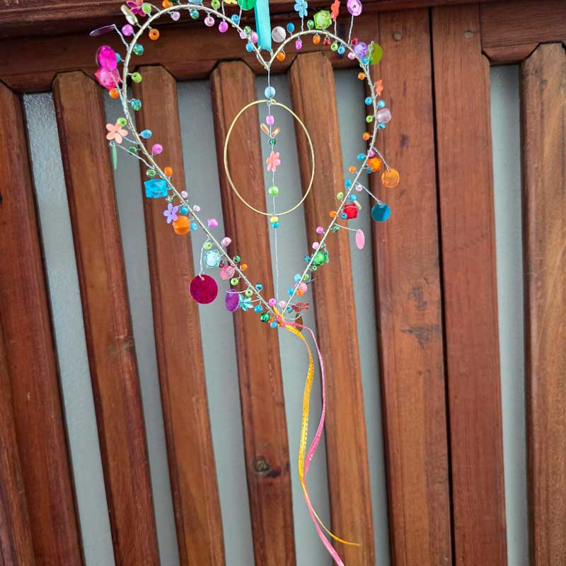 A stunning uniquely handmade hanging heart ornament in a mix of pretty colours. Crafted from small beads and bells around a wire heart shape. This heart is handmade by Artisan Decoration, a project that supports and empowers women.