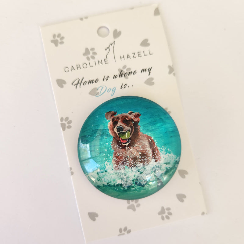 This is the perfect gift for your dog loving friends! A cute glass button magnet that comes on a gift card. Features a beautiful spaniel beach dog design.