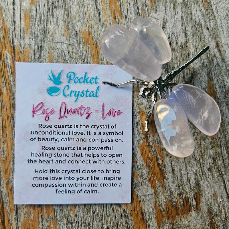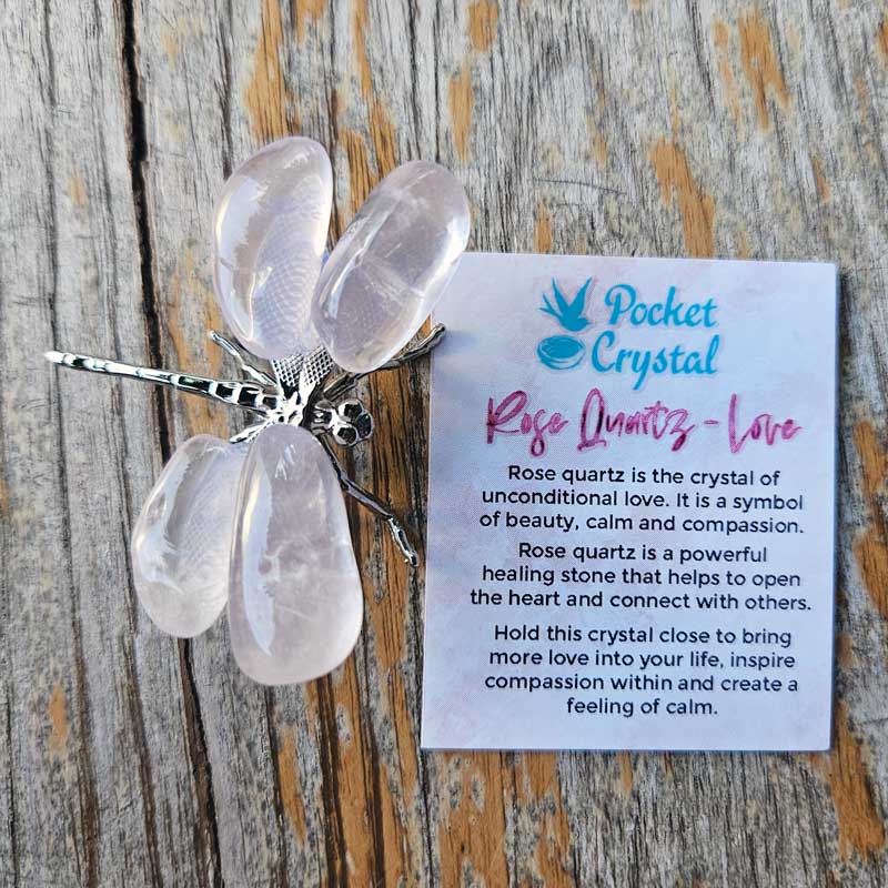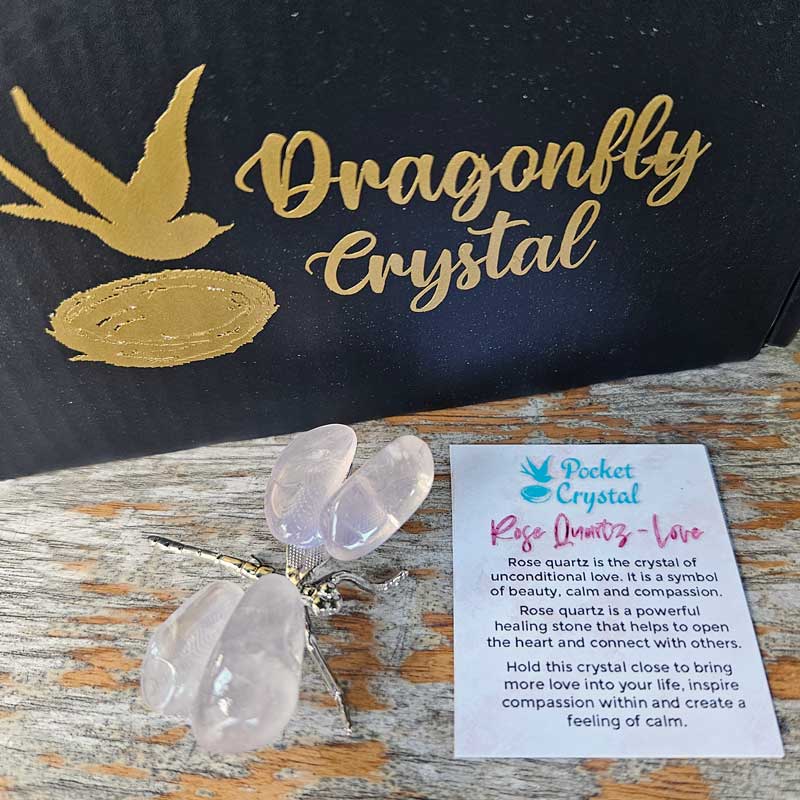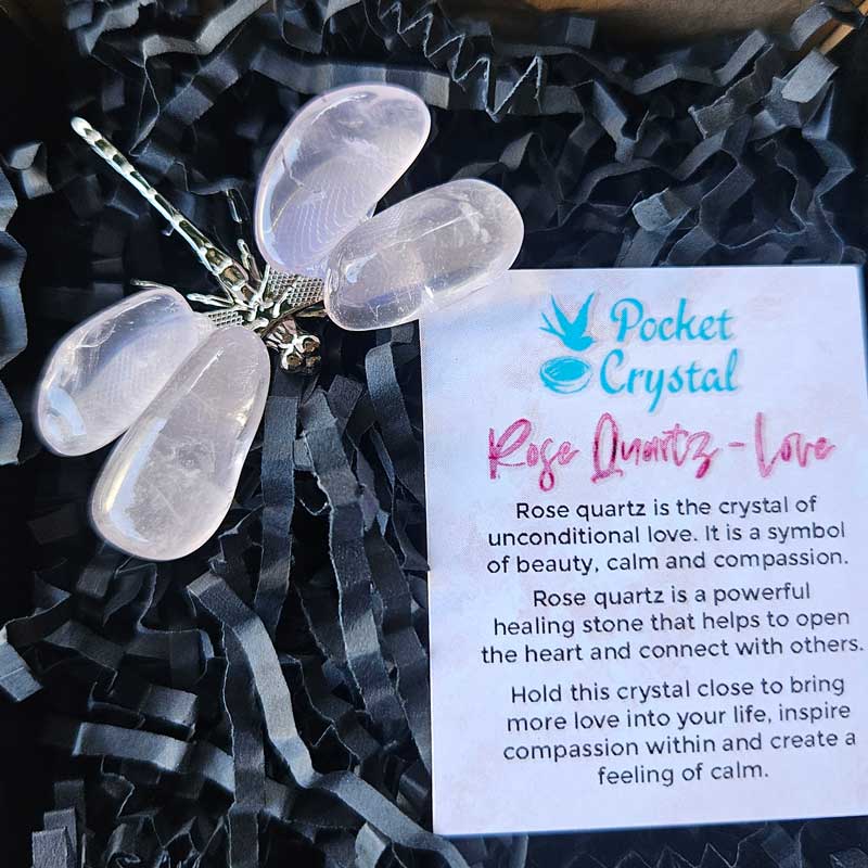 - Includes rose quartz dragonfly crystal, card with crystal properties and meaning and gift box.