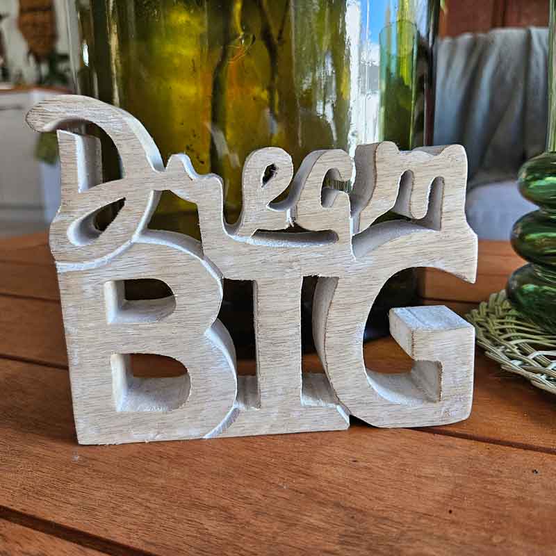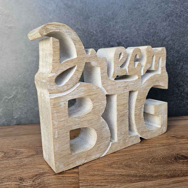 A handcarved wooden "Dream Big" sign that would look great on a bookcase, shelf or side table to add a touch of inspiration to your home. Made from recycled wood.