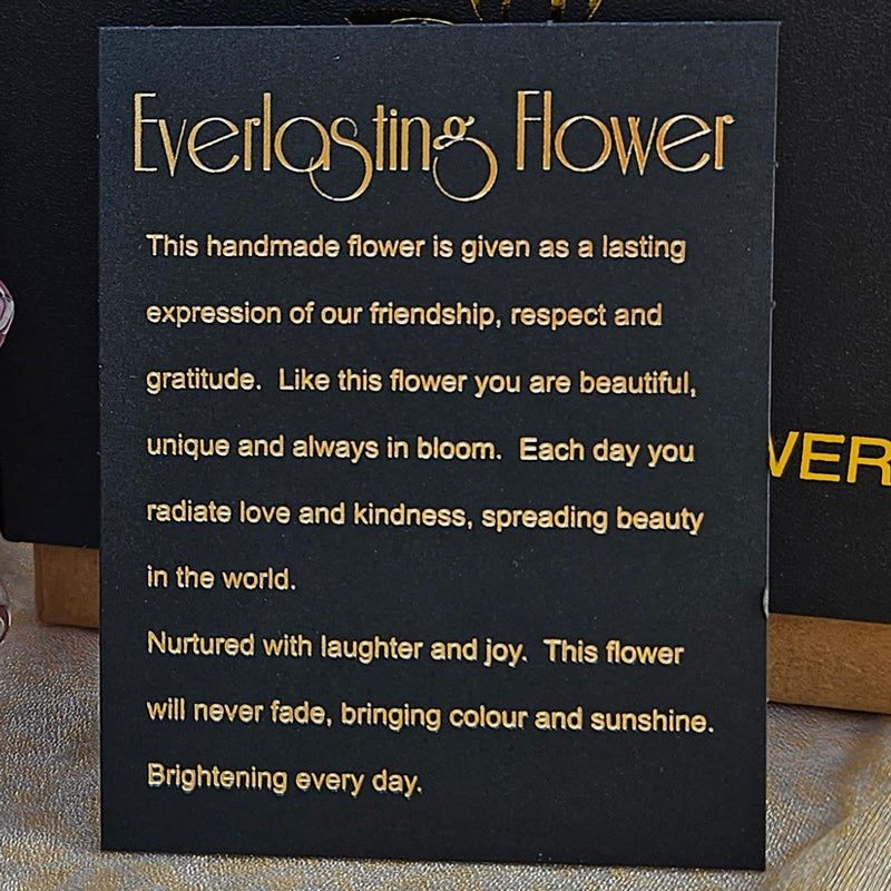 “This handmade flower is given as a lasting expression of our friendship, respect and gratitude. Like this flower you are beautiful, unique and always in bloom. Each day you radiate love and kindness and spread beauty in the world. Nurtured with laughter and joy. This flower will never fade, bringing colour and sunshine. Brightening every day.”