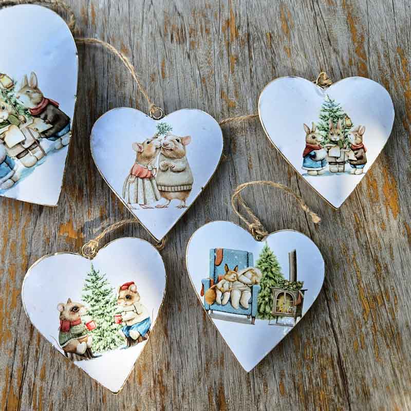 Festive Rabbits Metal Heart Ornament - Sleeping