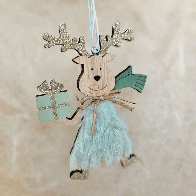 Fluffy Reindeer Christmas Ornament Holding Present - Sage