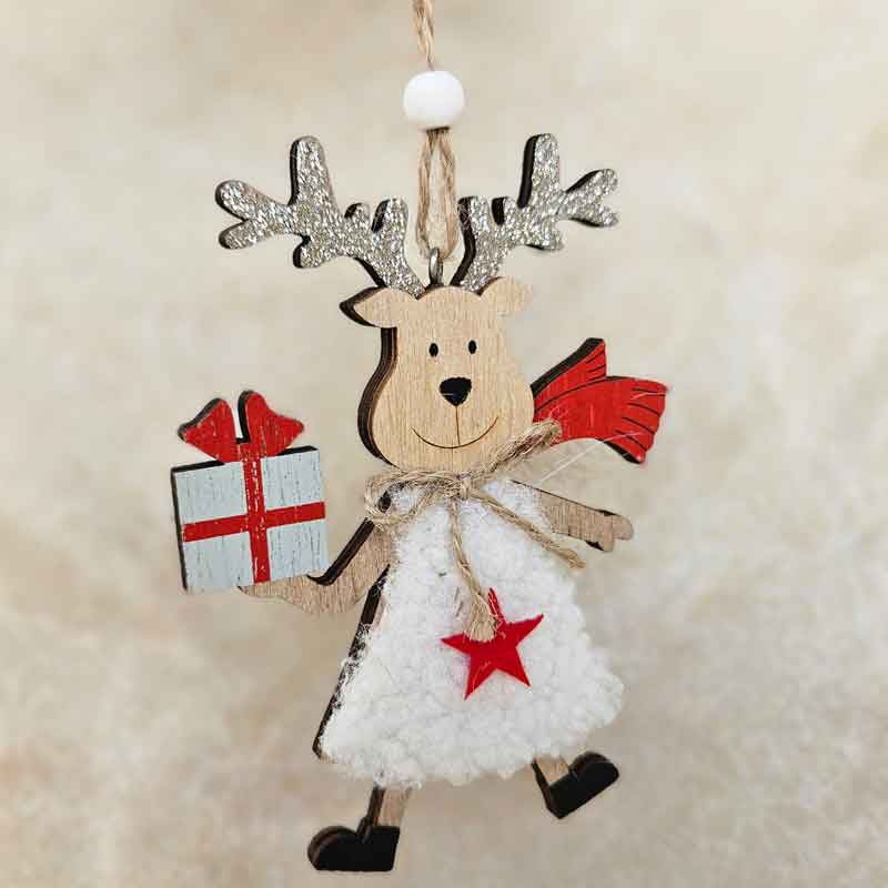 Fluffy Reindeer Christmas Ornament Holding Present - White