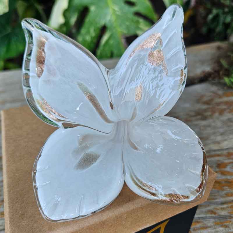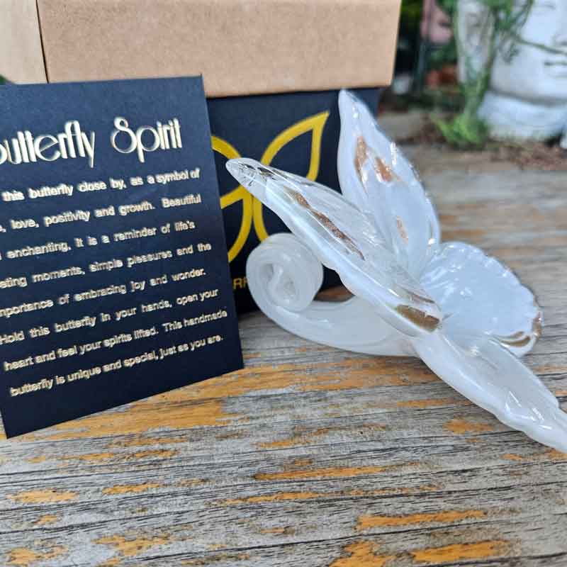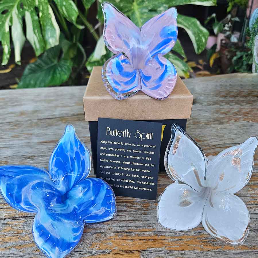 Show someone how much you care with this beautiful handmade glass Butterfly Spirit! This stunning butterfly has been hand made and mouth blown to create a one of a kind piece, perfect for a one of a kind friend, family member, partner or loved one!