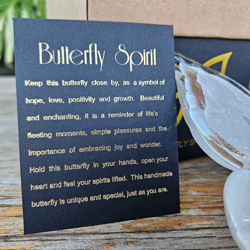 “Keep this Buttefly close by, as a symbol of hope, love, positivity and growth.  Beautiful and enchanting, it is a reminder of life’s fleeting moments, simple pleasures and the importance of embracing joy and wonder.  Hold this butterfly in your hands, open your heart and feel your spirits lifted.  This handmade butterfly is unqiue and special, just as you are.”