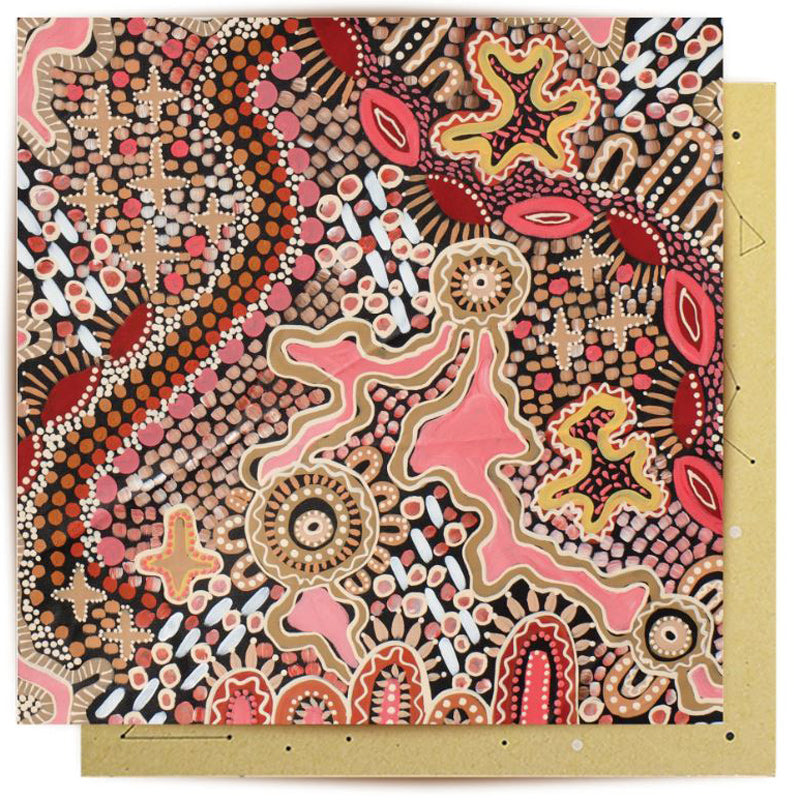 A 14 x 14cm greeting card with illustrations both inside and out. Made in Australia. Artwork by Glenda McCulloch, a first nations contemporary artist. Kalkatungu Country is her home and continues to be a main source of inspiration.