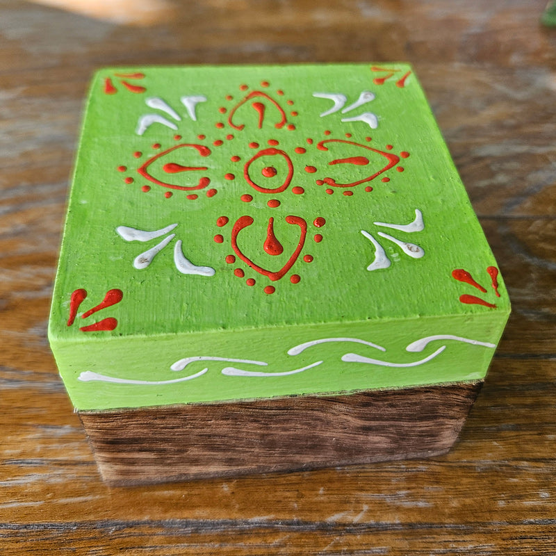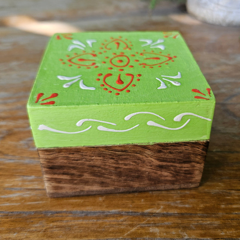 A beautiful mini box made from wood featuring a handpainted design on the lid. Handcrafted by Artisans in India, this stunning wooden mini box will make a delightful gift, including for yourself! The perfect place to store small jewellery items like earrings or rings.