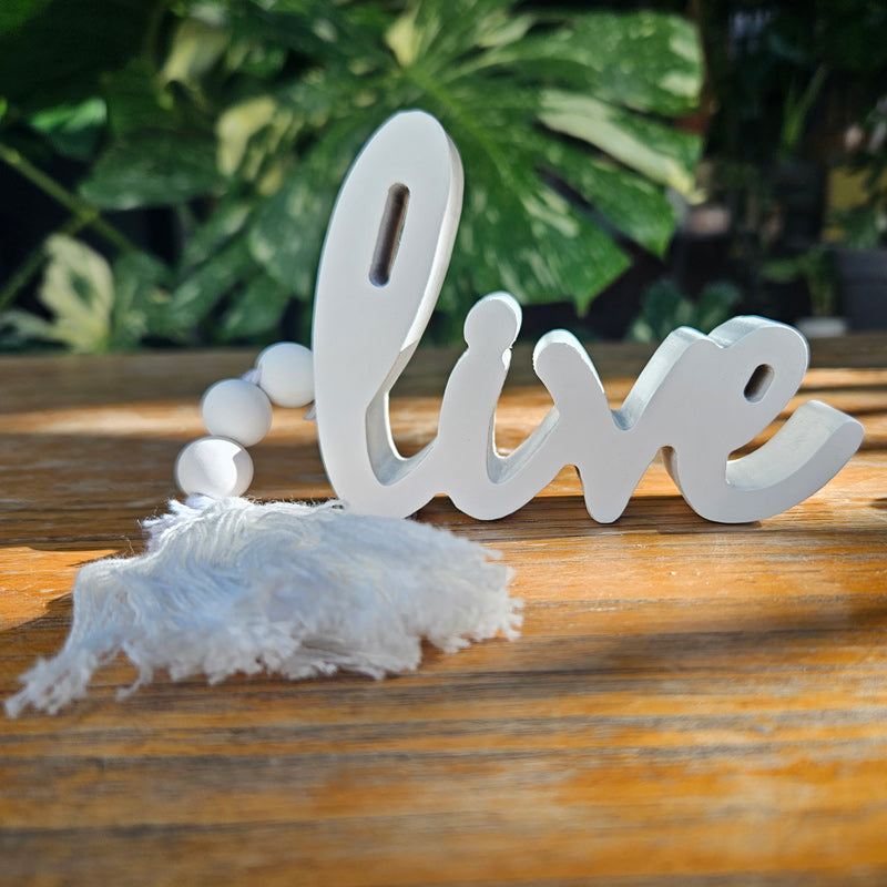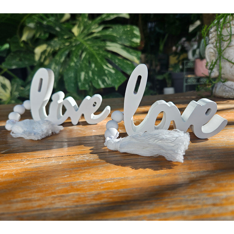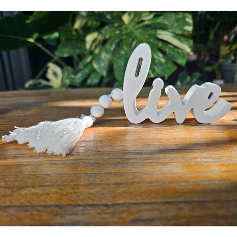 A pretty, decorative live sign that would look great on a bookcase, shelf or side table . Made from wood with a fabric tassel on the end..