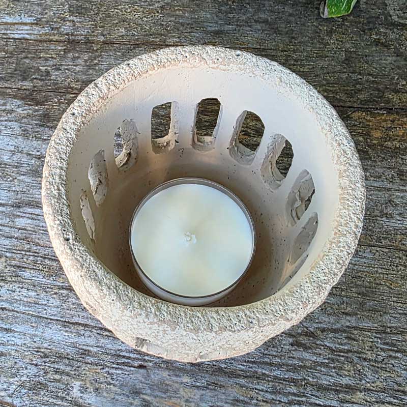 This beautiful candle holder has been crafted in a Mediterranean inspired design that is perfect for holding a tealight or maxi tealight candle. We love the textured cement finish and the see through slots to allow the candle glow to shine through.