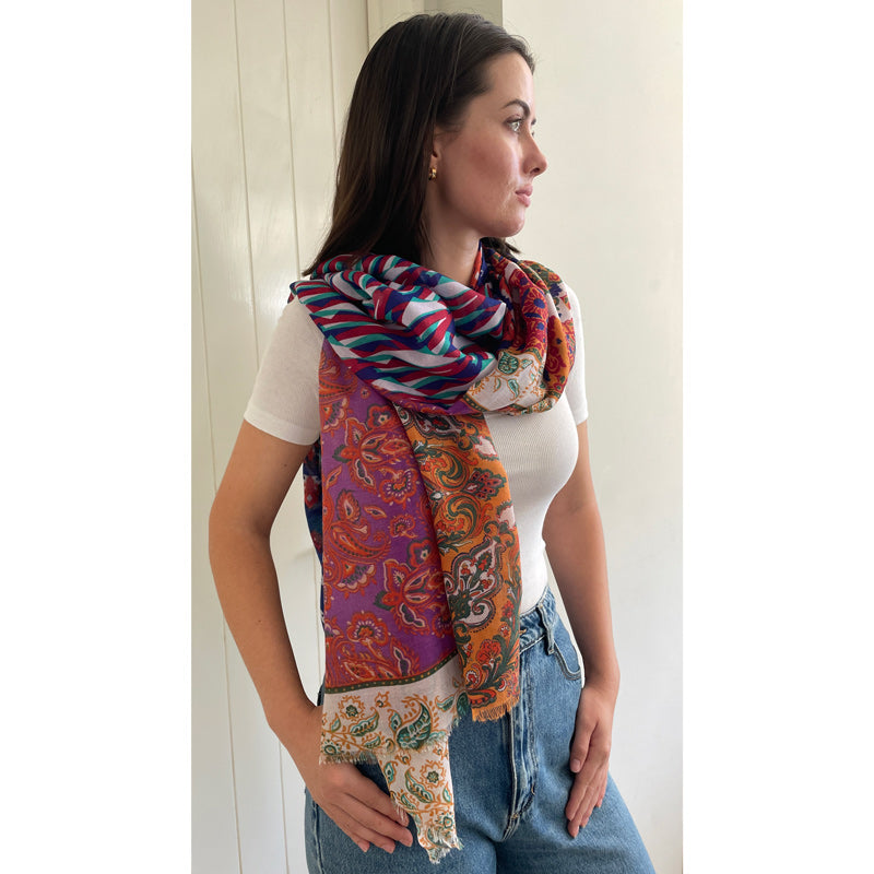 A very pretty super soft scarf in a striking and eye catching multicoloured design.