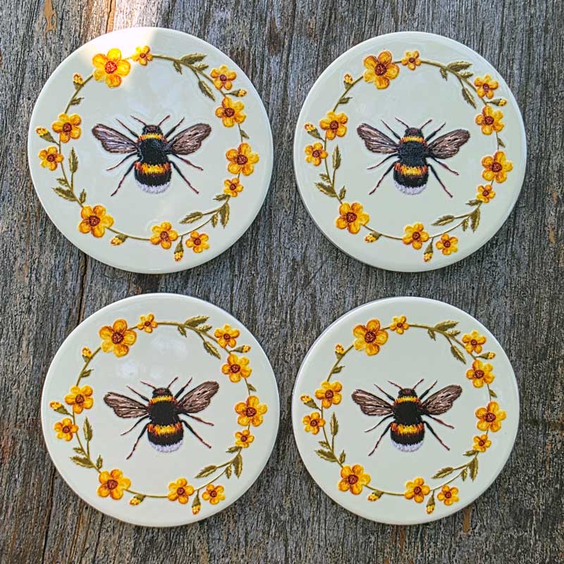 How pretty is this set of 4 bee coasters! A must for anyone that loves bees. Such a beautiful coaster set featuring an eye catching floral wreath design.