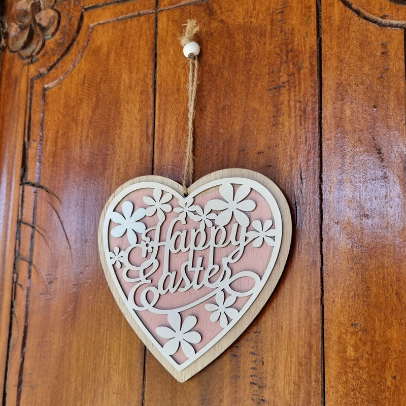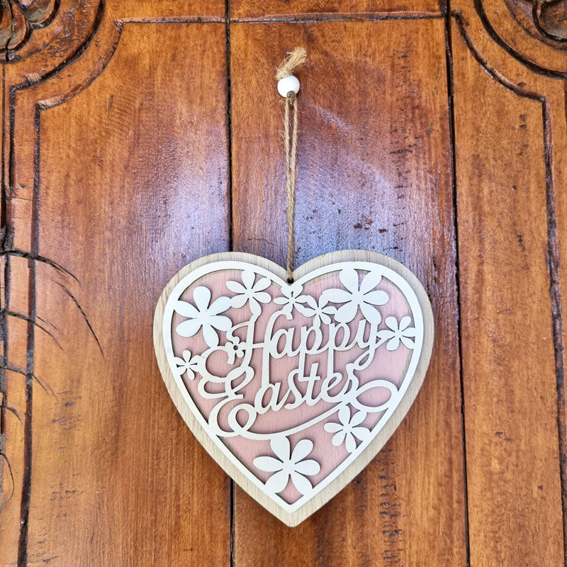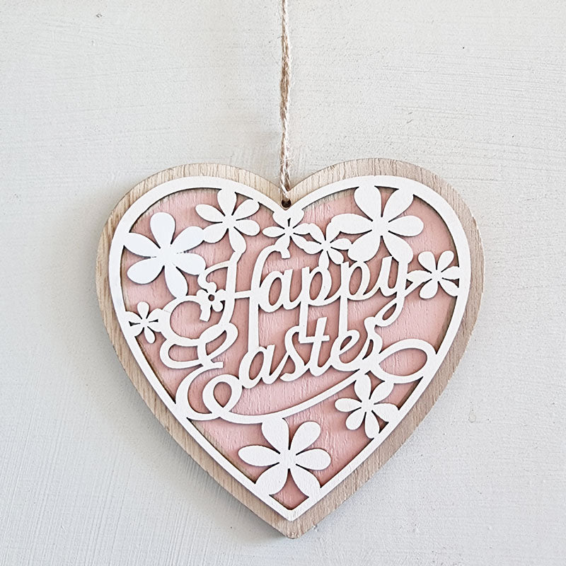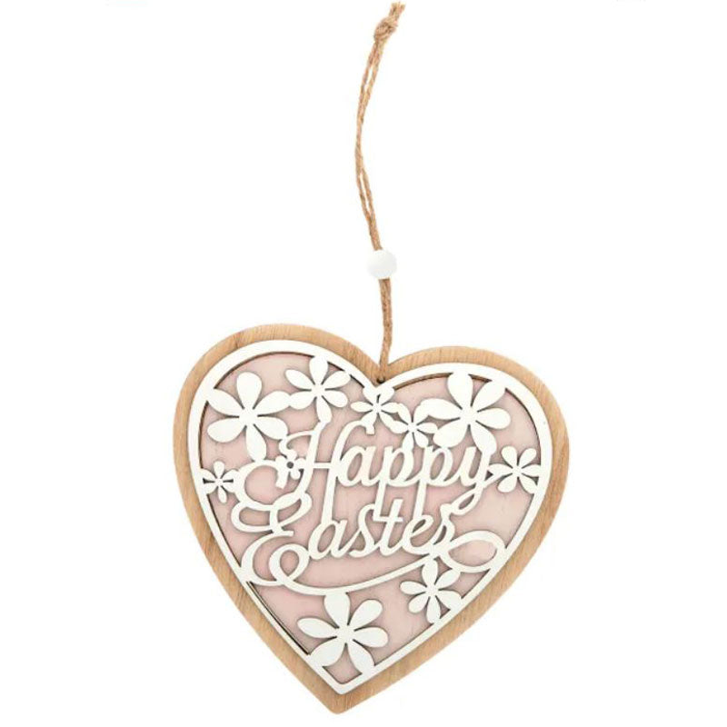 A cute hanging heart ornament with a pretty Happy Easter design.