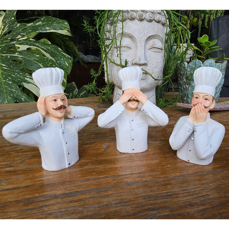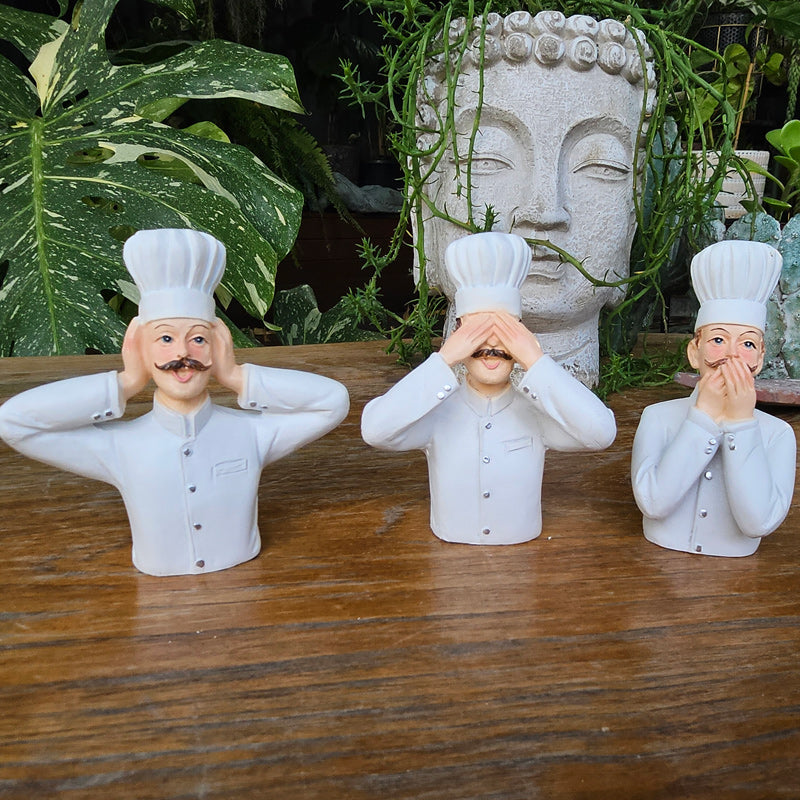 This trio of wise chefs represents the old saying "See no evil, hear no evil, speak no evil".