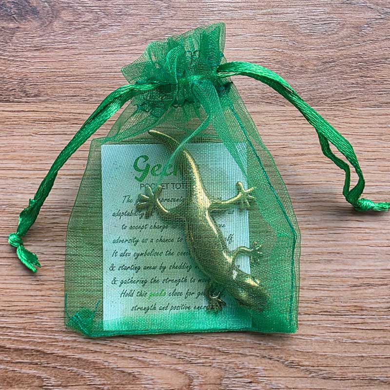 "The gecko represents good fortune, adaptability & regeneration. It reminds us to accept change as it comes and see adversity as a chance to improve yourself. It also symbolises the concept of letting go & starting anew by shedding negative energy & gathering the strength to move forward. Hold this gecko close for good luck, strength and positive energy."
