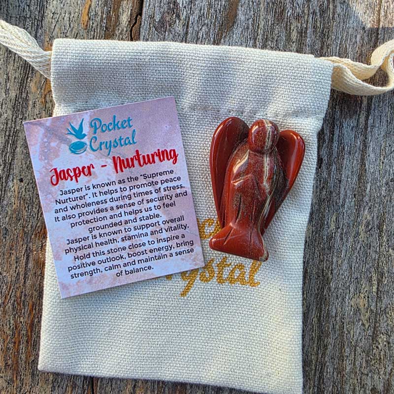 - Includes jasper angel crystal, card with crystal properties and meaning and fabric drawstring bag.