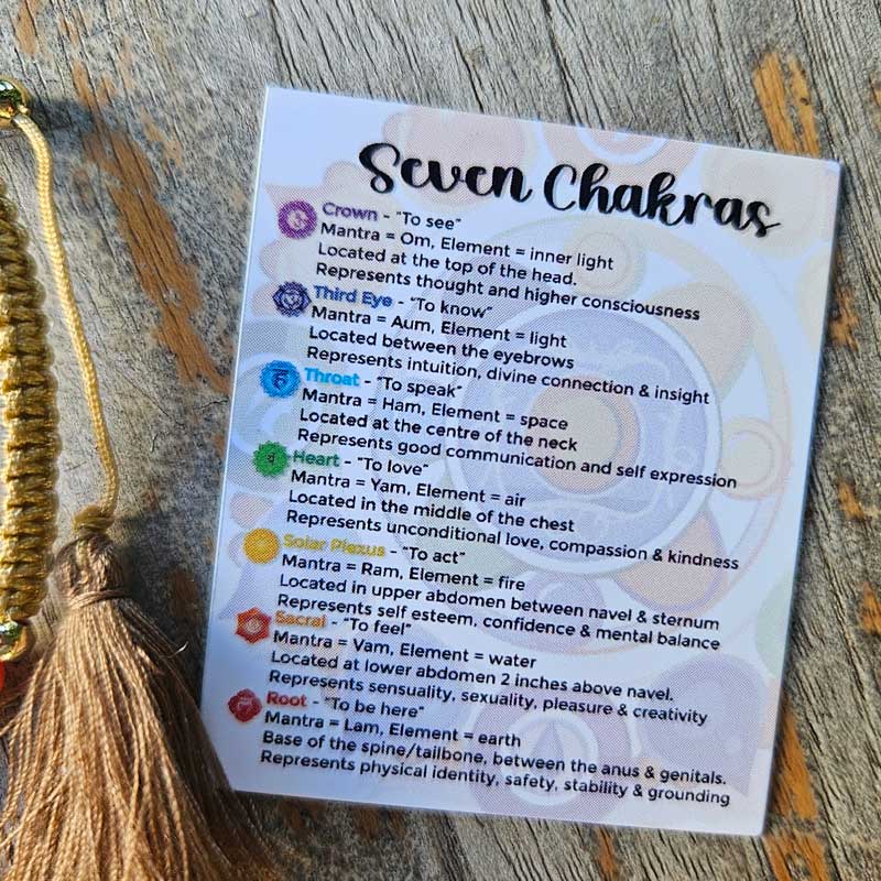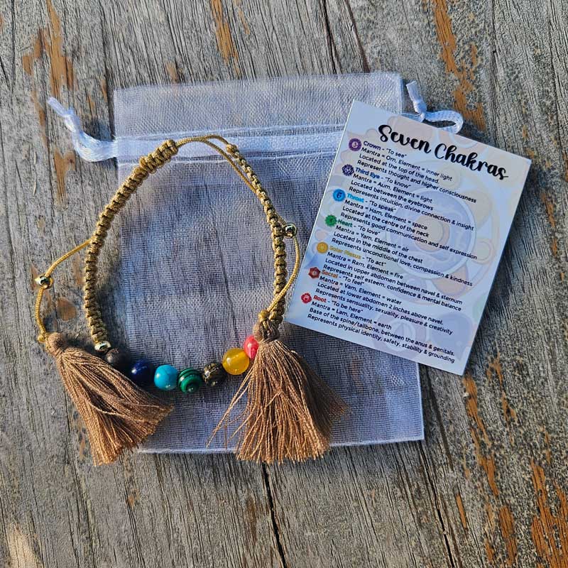 A beautiful adjustable bracelet featuring stones in the 7 Chakras. The 7 Chakras are the main energy points in the body that run down the spine. Each chakra represents an energy centre and the object is to have energy flowing from the root to the crown.