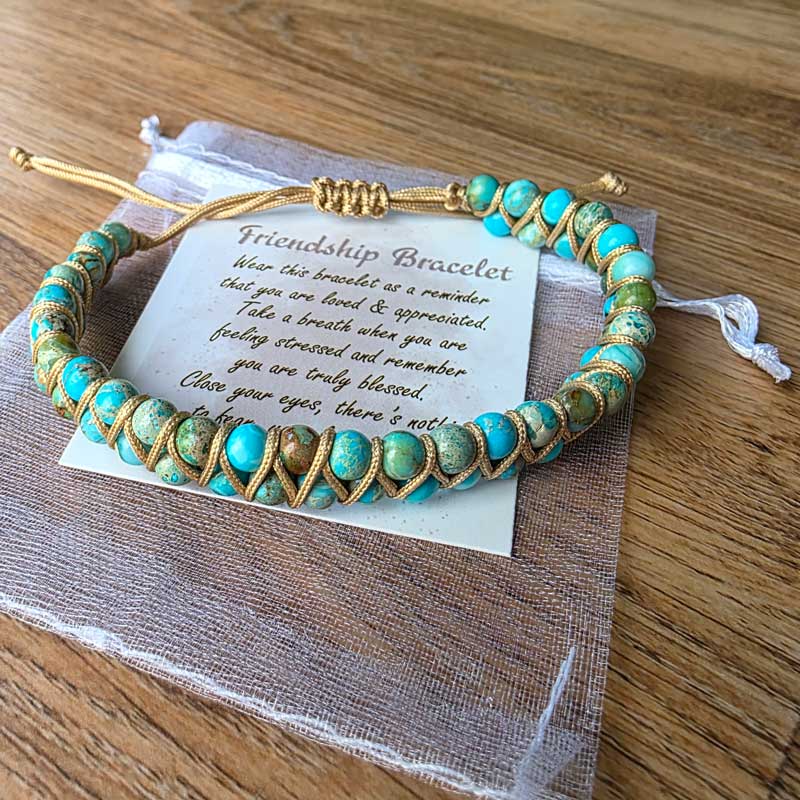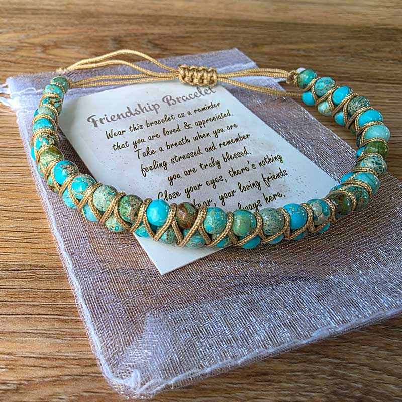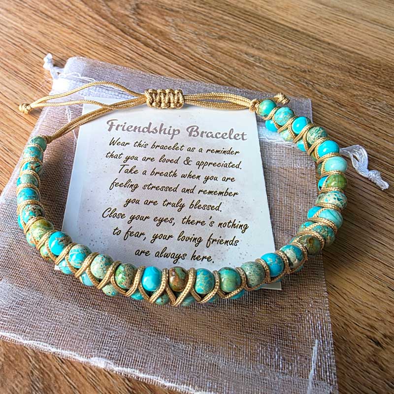 The words on the included affirmation card are: "Wear this bracelet as a reminder that you are loved and appreciated. Take a breath when you are feeling stressed and remember you are truly blessed. Close your eyes there's nothing to fear, your loving friends are always here".