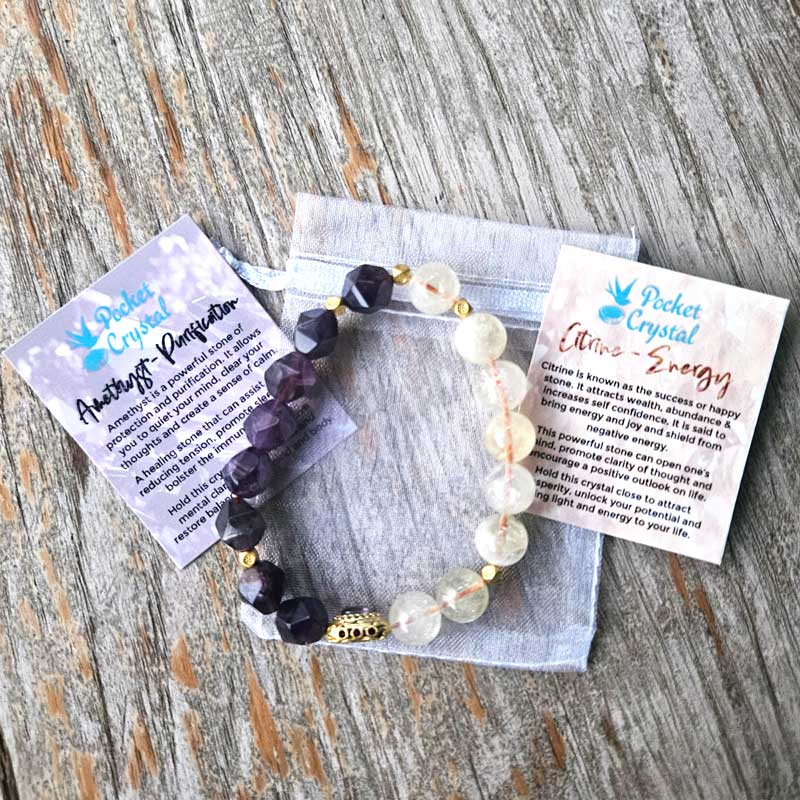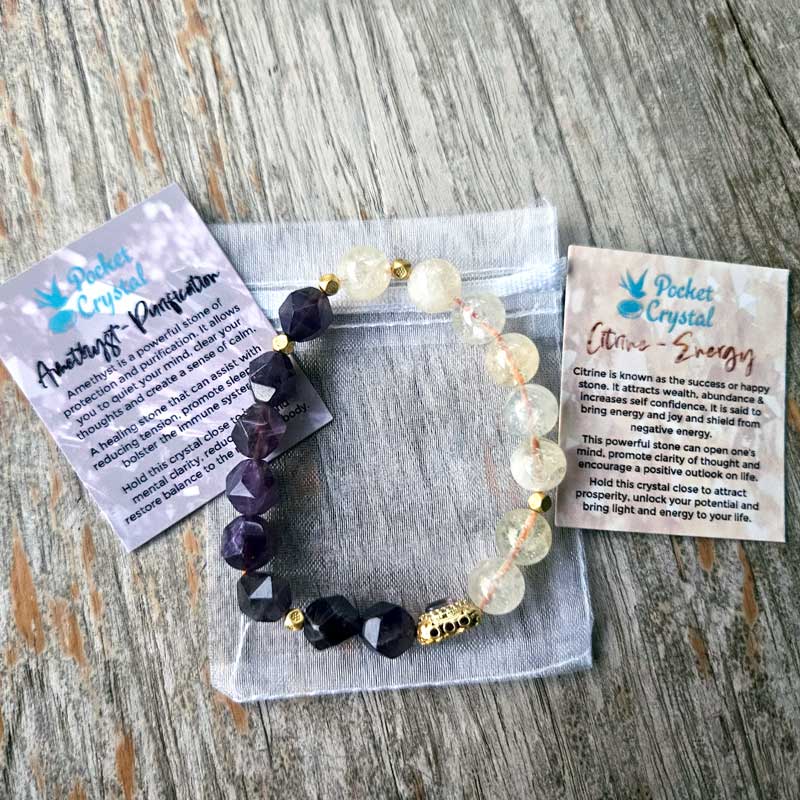 A beautiful bracelet featuring amethyst and citrine faceted crystal stones. There is nothing like wearing natural stone and these bracelets work perfectly on their own, or layered into beautiful stacks to create a more dramatic look.