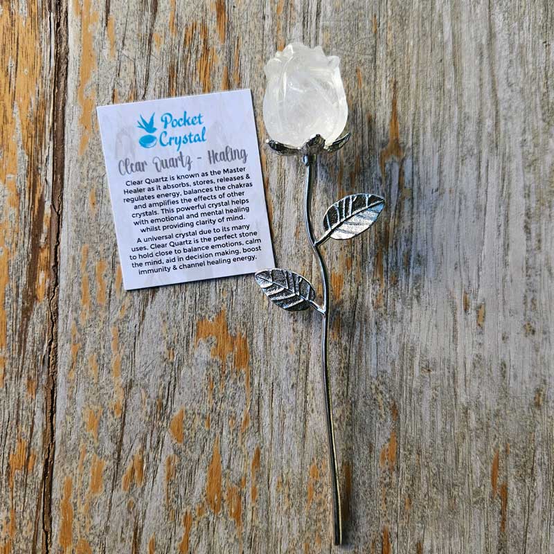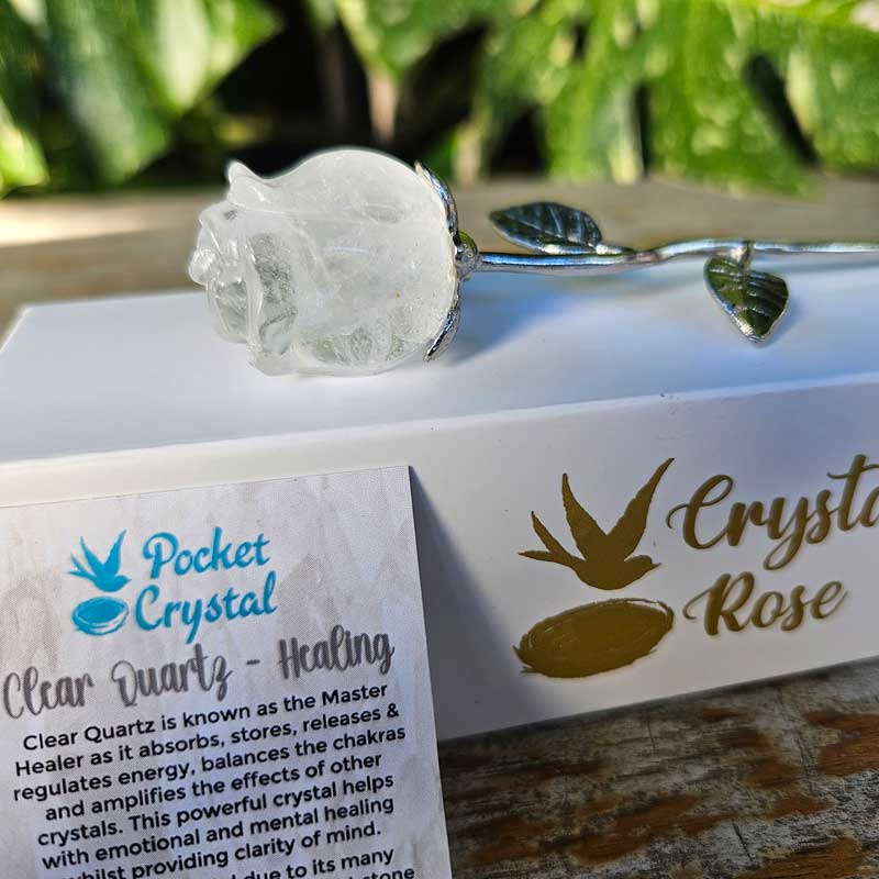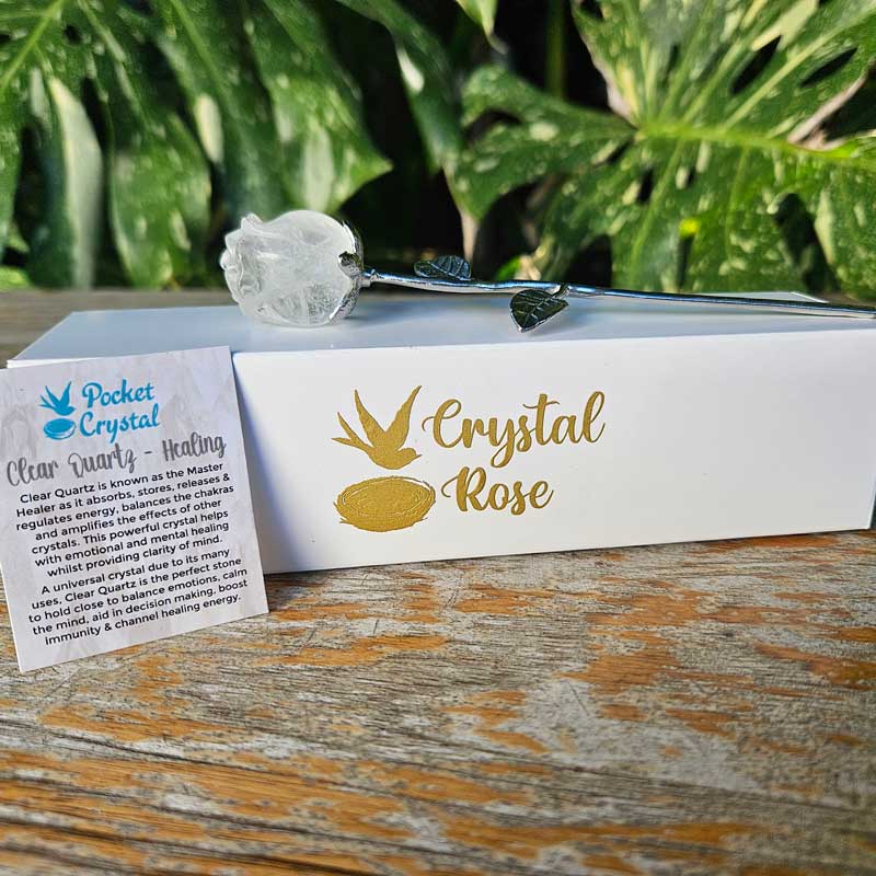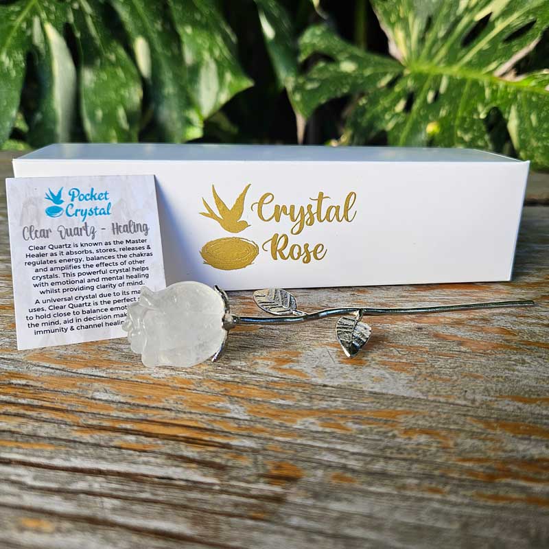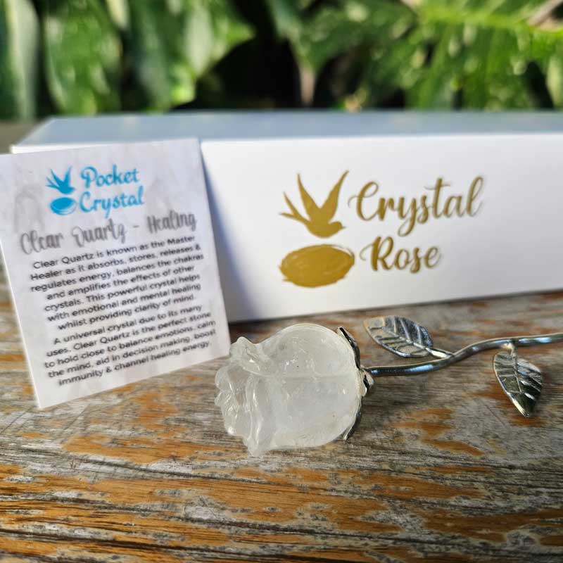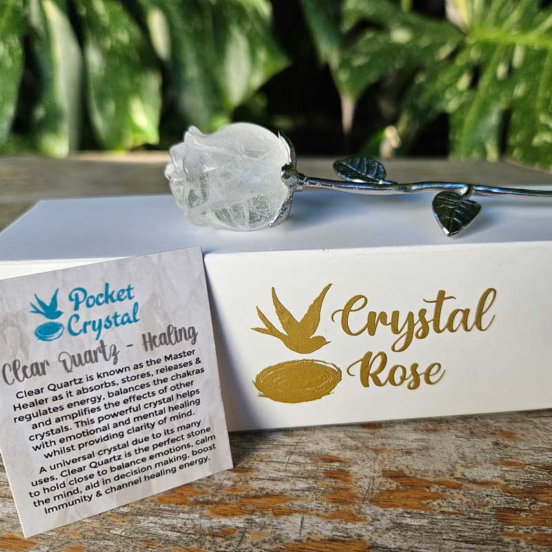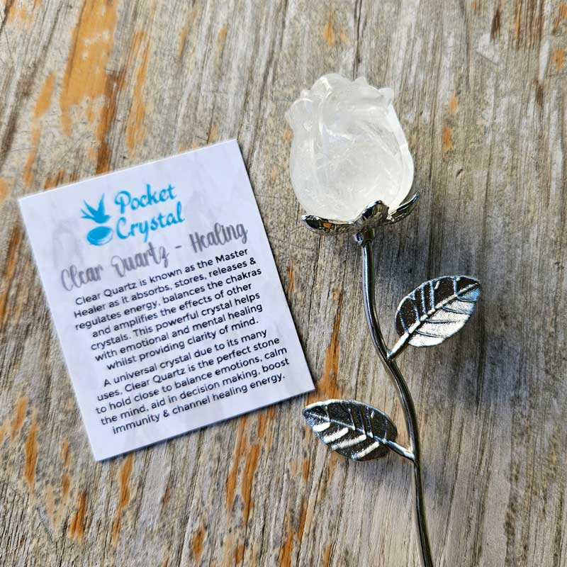 Includes a crystal & metal rose and a card with the crystal's unique meaning and properties.