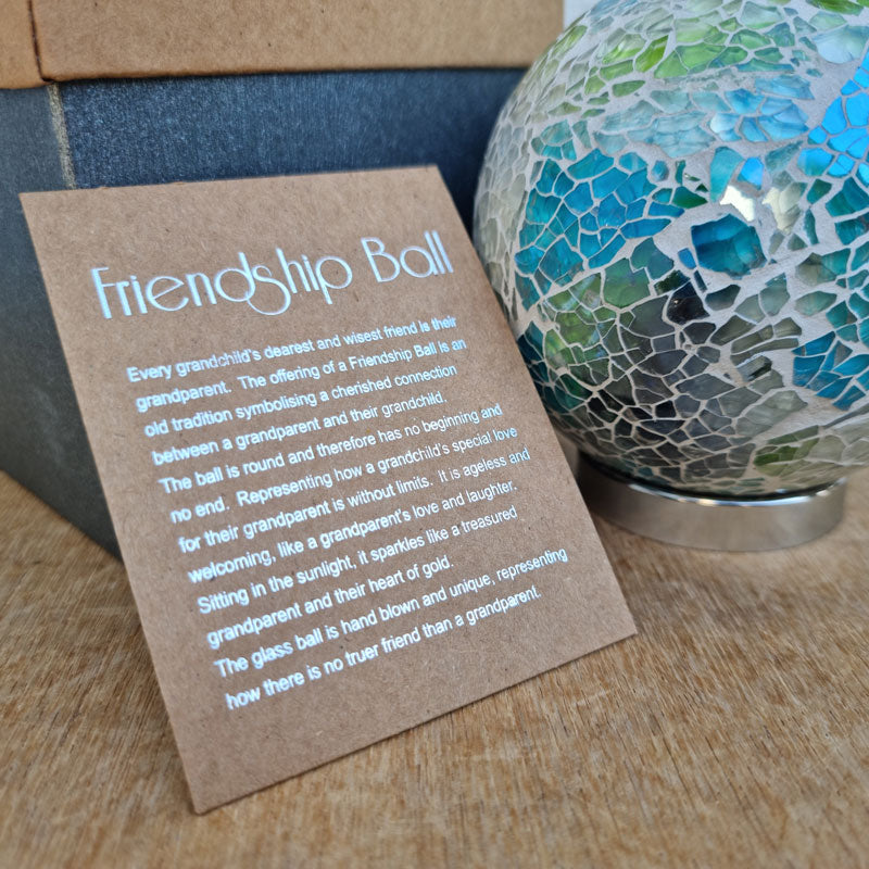 “Every grandchild's dearest and wisest friend is their grandparent. The offering of a Friendship Ball is an old tradition symbolising a cherished connection between a grandparent and their grandchild. The ball is round and therefore has no beginning and no end. Representing how a grandchild's special love for their grandparent is without limits. It is ageless and welcoming, like a grandparent’s love and laughter. Sitting in the sunlight, it sparkles like a treasured grandparent and their heart of gold. The glass ball is hand blown and unique, representing how there is no truer friend than a grandparent.”