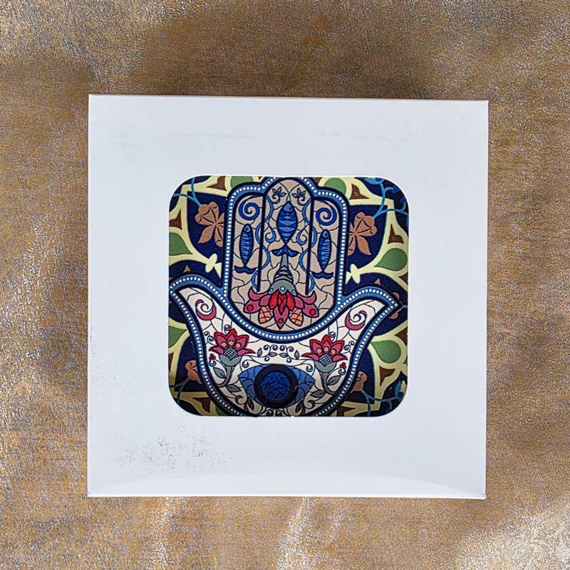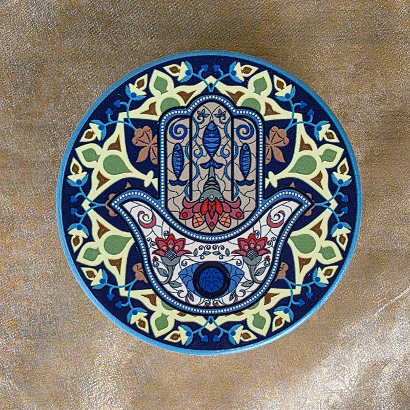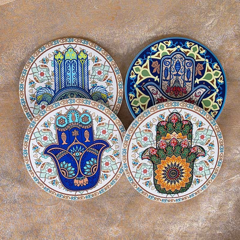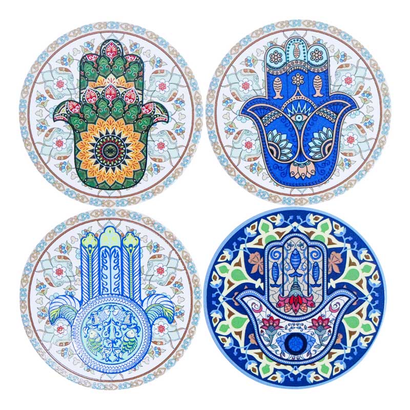 This coaster set features a beautiful hamsa hand design in 4 different patterns. Includes four coasters in each set.