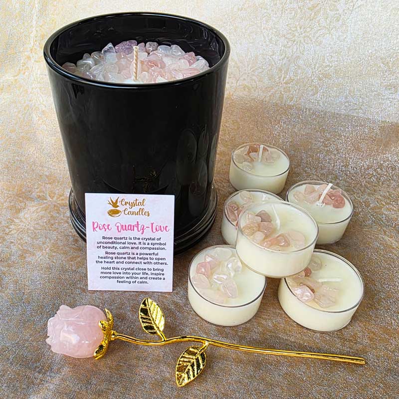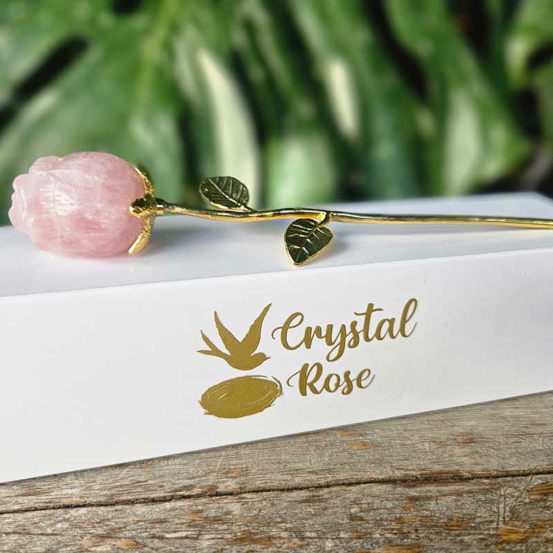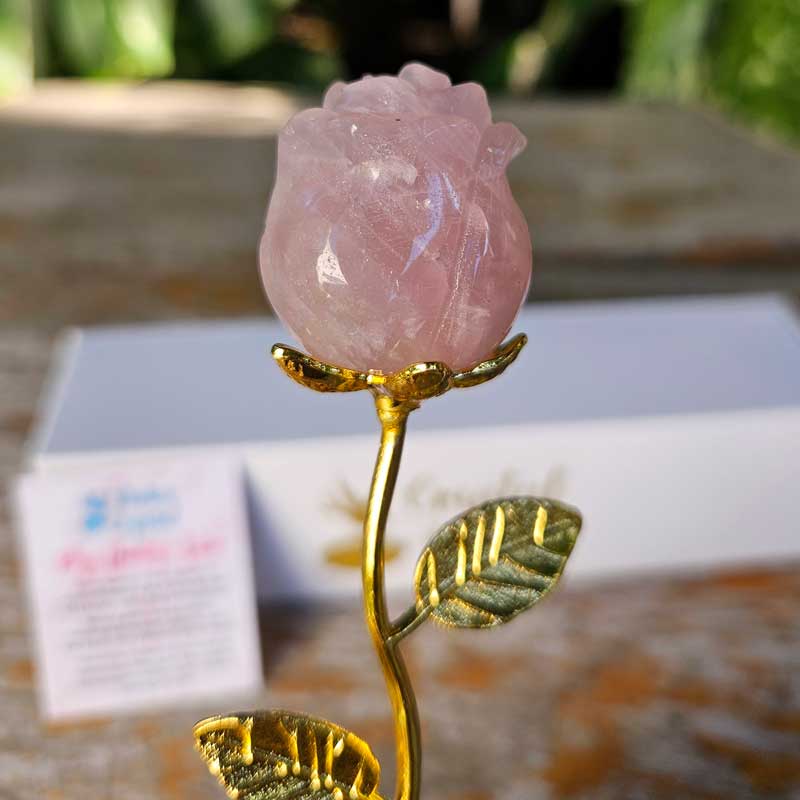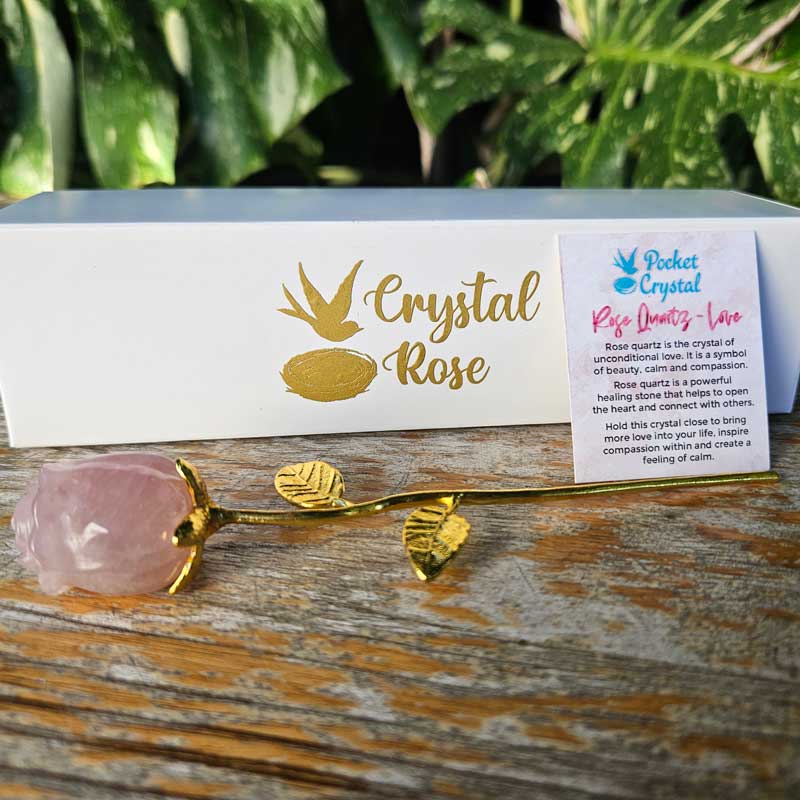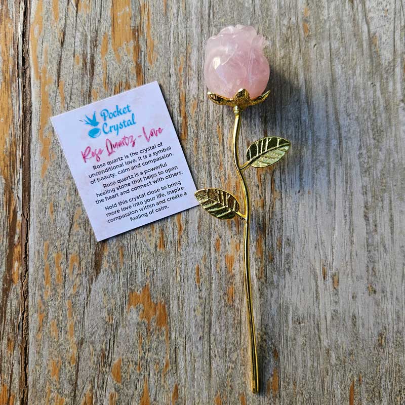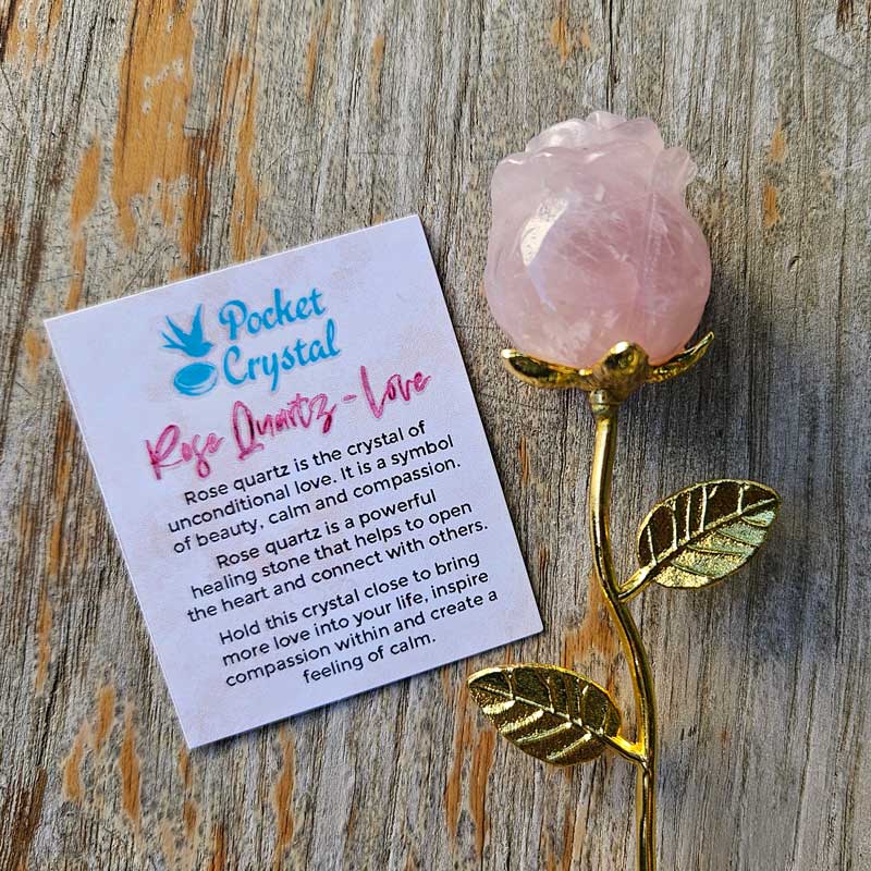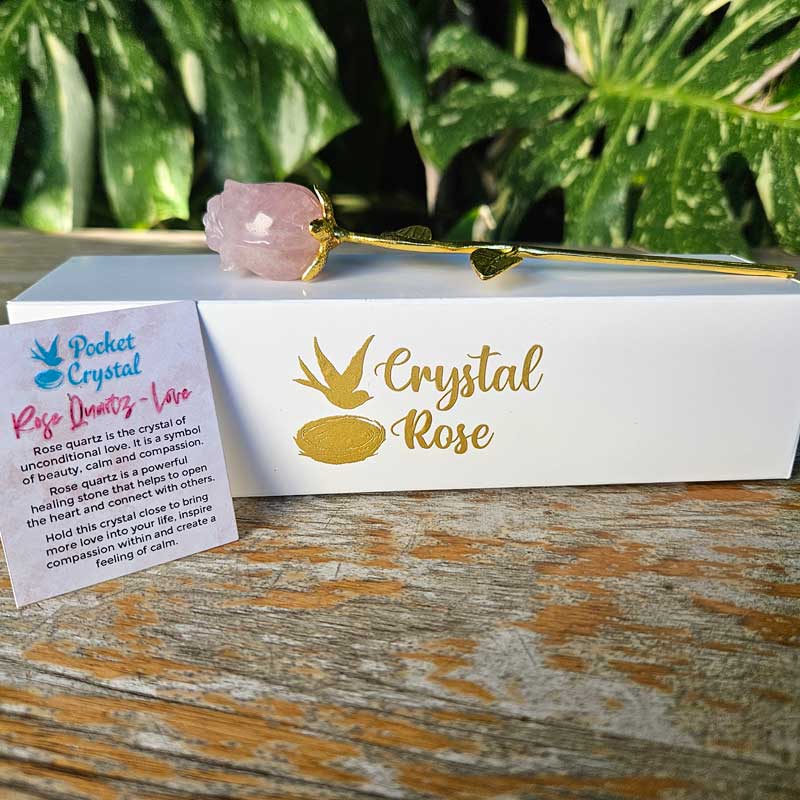 Includes a crystal & metal rose and a card with the crystal's unique meaning and properties.